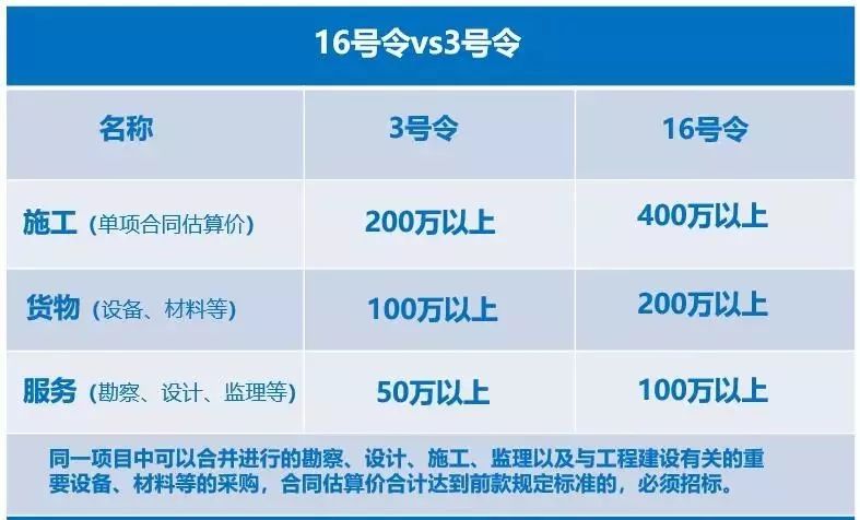 与原3号令相比提高了一倍。同时,取消了“单项合同估算价低于上述规定的标准,但项目总投资在3000万元人民币以上”的规定。